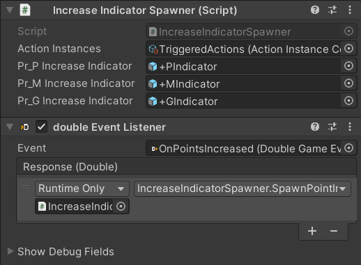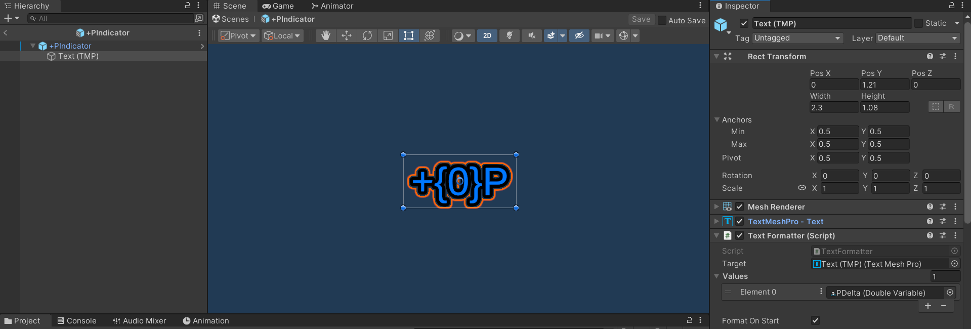 The indicator prefab contains text that, when instanced, is automatically formatted to the PDelta value (the difference in points since the last change). Once again, this is completely decoupled from the other systems, even the indicator spawner itself!