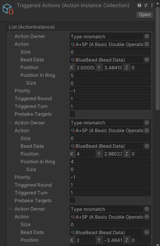 All “action instances” are stored in a collection of “triggered actions”, which contain information on which action was executed, which charm executed it, which round/turn it was executed in…